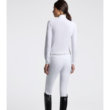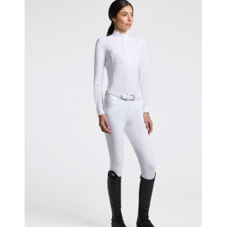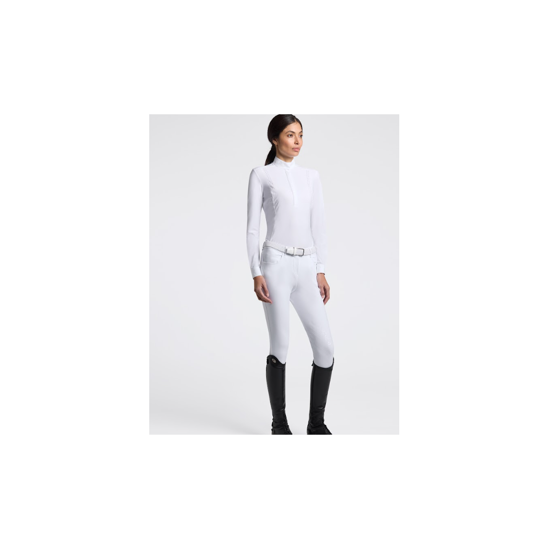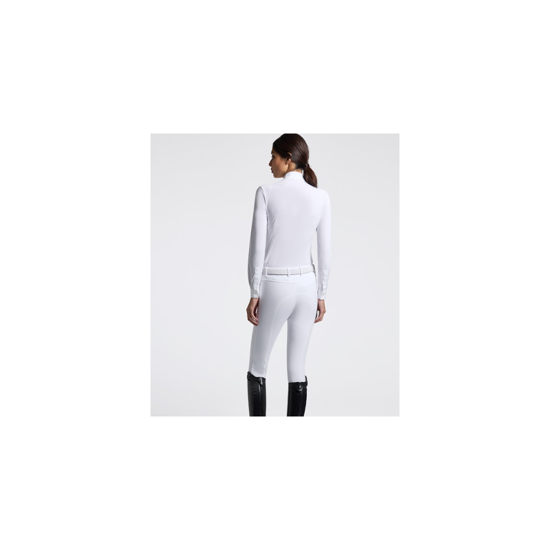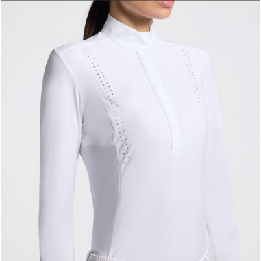 Le polo de compétition à manches longues Cavalleria Toscana pour femme avec empiècements découpés au laser est conçu pour offrir confort, respirabilité et élégance raffinée à chaque compétition. Confectionné en jersey technique extensible, il épouse parfaitement la silhouette tout en garantissant une liberté de mouvement maximale. Son col en popeline blanche impeccable et ses boutons dissimulés lui confèrent une esthétique soignée et formelle. Les détails découpés au laser sur les côtés apportent une touche moderne et sophistiquée tout en améliorant la ventilation pendant l'effort. Orné du logo Cavalleria Toscana brodé sur la poitrine, ce maillot est le choix idéal pour les cavalières en quête d'un équipement performant et de l'élégance signature de la marque.
