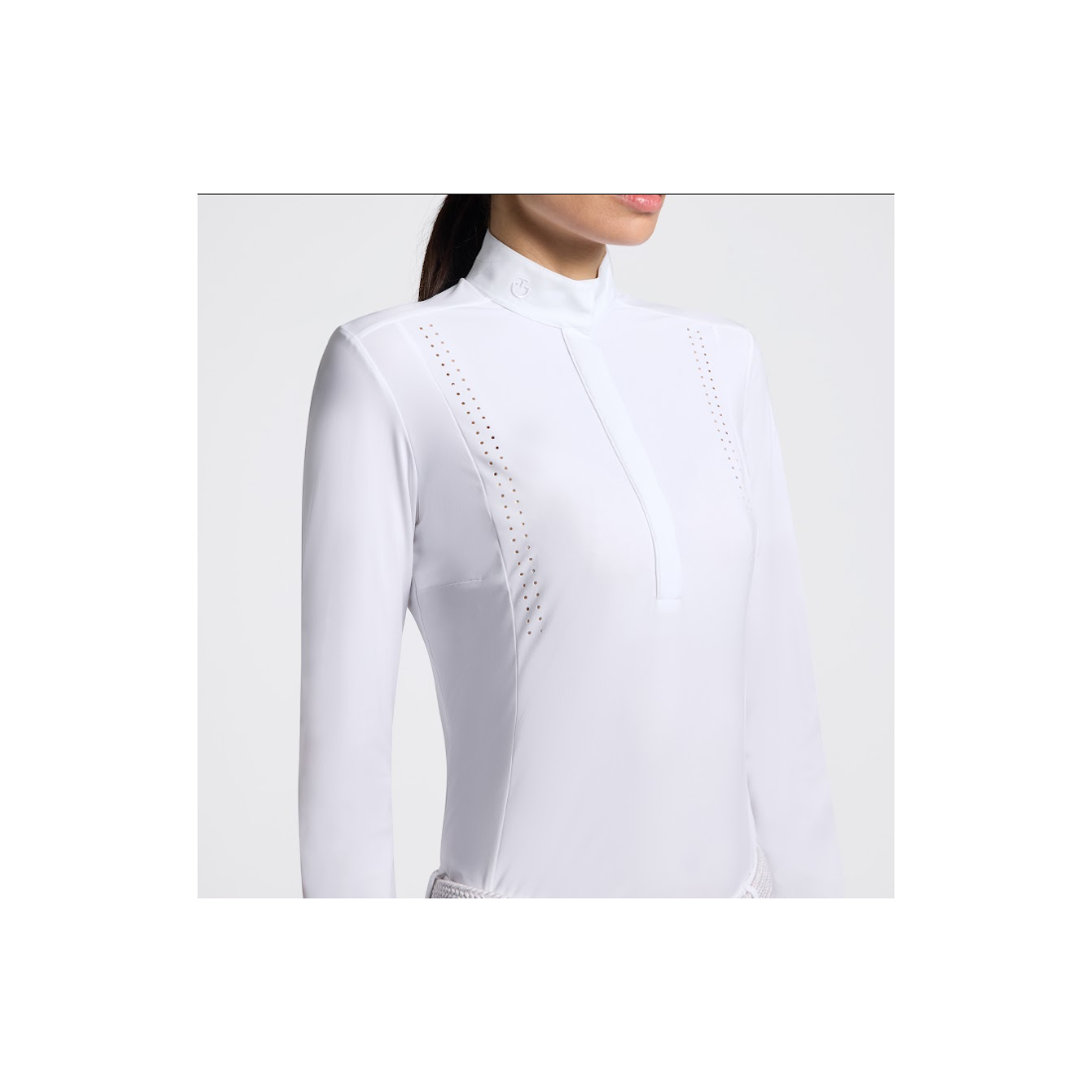 Polo de compétition femme manches longues Cavalleria Toscana en jersey technique avec col, découpes laser et boutons cachés. Il allie élégance et fonctionnalité haute performance sur le terrain.